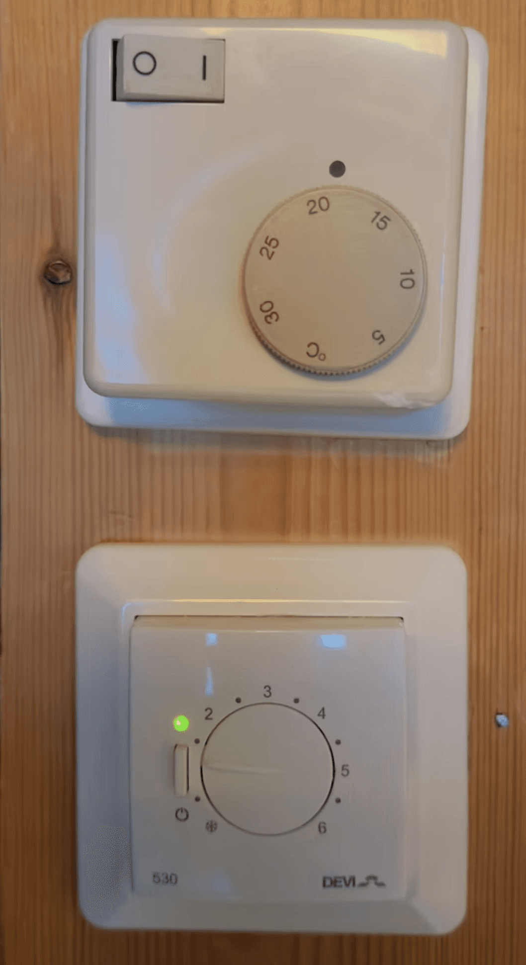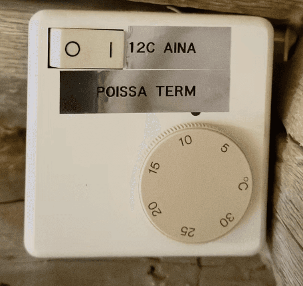 The entrance, dressing room and master bathroom have heated floors. These can be adjusted via similar thermostats as the lower one on the picture. The thermostat for changing room floor heating is located on top of the water valve for washing machine. Note that adjusting floor heating will take up to 12-18h for a noticeable change.
