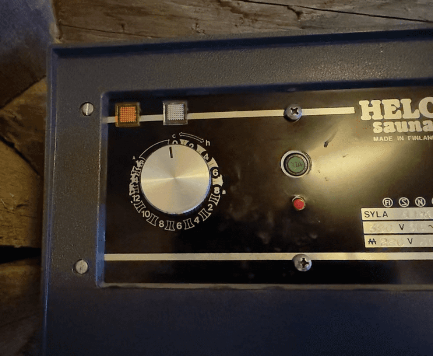 In the dressing room, rotate the knob clockwise until between 2-4h (1 to 3 o'clock), this is the timer and thus the sauna will turn off when the timer runs out.