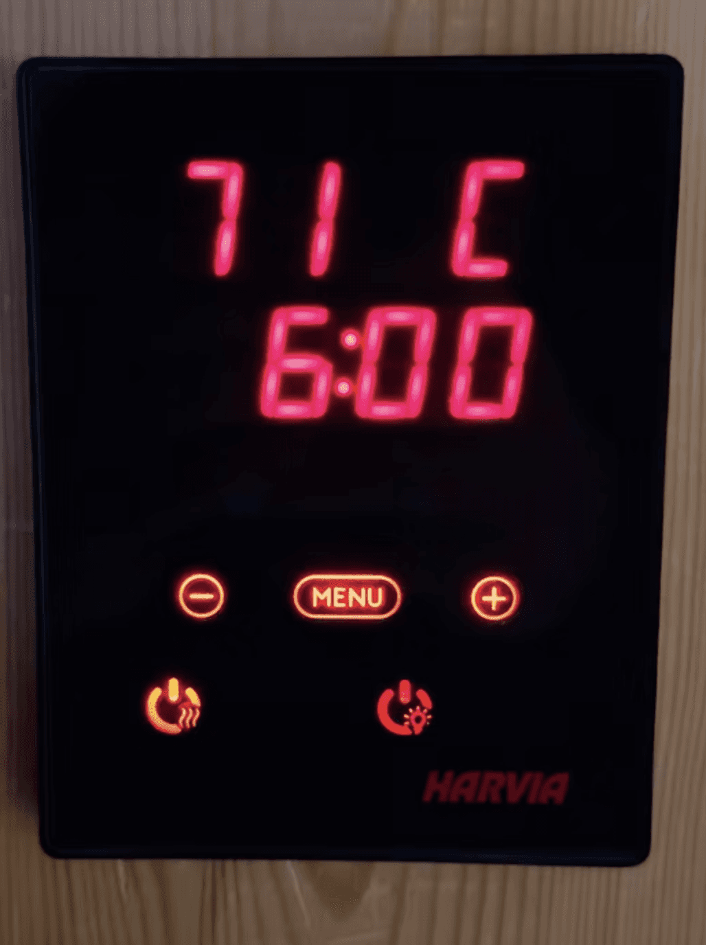 Turn on the sauna by pressing once on the power button to the left. It will automatically show for a few seconds set temperature and then switch to show current temperature.
